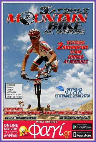 Ο ΝΠΔΔ Παιδείας Πολιτισμού και Αθλητισμού Δήμου ΛΕΣΒΟΥ σε συνεργασία με την Τοπική Κοινότητα Αγίας Μαρίνας και την Τοπική Κοινότητα Ταξιαρχών διοργανώνουν τον 3ο Αγώνα ΜΤΒ (Mountain bike) Αγίας Μαρίνας, ο οποίος θα γίνει την Κυριακή 2 Νοεμβρίου και ώρα 11 στο Γήπεδο της Αγίας Μαρίνας .