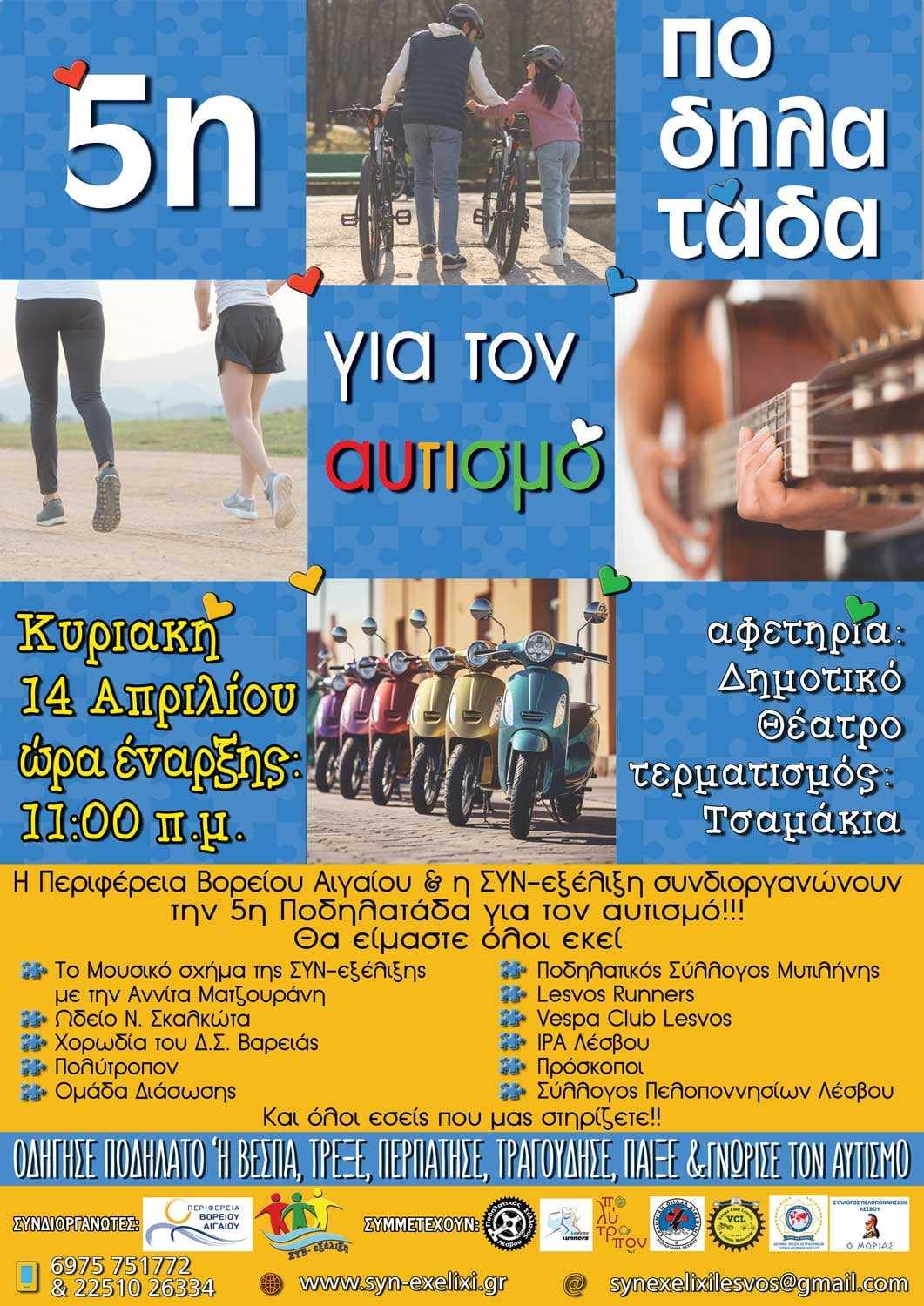 Την Κυριακή 14/4/2024 στις 11:00 θα συγκεντρωθούμε μπροστά στο Δημοτικό Θέατρο Μυτιλήνης για να ποδηλατίσουμε, να τρέξουμε, να περπατήσουμε και να γνωρίσουμε τον αυτισμό. Ελάτε να γνωρίσουμε το ποδήλατο ως παιχνίδι αλλά και ως μέσο μετακίνησης. Ελάτε όλοι να δείξουμε ότι είμαστε όλοι ίδιοι, όλοι διαφορετικοί και μπορούμε να είμαστε και όλοι μαζί. Στον τερματισμό μας στα Τσαμάκια της Μυτιλήνης πάνω από τον Ποδηλατόδρομο, θα πραγματοποιηθεί μια σειρά εκδηλώσεων από πολλούς συνδιοργανωτές συλλόγους. Συμμετέχουν: Το μουσικό σχήμα της Συν-εξέλιξης με την Αννίτα Ματζουράνη, ο Ποδηλατικός Σύλλογος Λέσβου, οι Lesvos Runners, το Ωδείο Ν. Σκαλκώτας, το Vespa Club Lesvos, η Χορωδία του Δ.Σ. Βαρειάς, η ΙΡΑ Λέσβου, το Πολύτροπον, οι Πρόσκοποι, η Ελληνική Ομάδα Διάσωσης Παράρτημα Λέσβου και ο σύλλογος Πελοποννησίων ο Μοριάς.