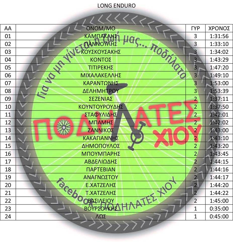 Ανακοινώθηκαν και επίσημα τα αποτελέσματα του 1st Chios Mountain Race που πραγματοποιήθηκε την Κυριακή 26 Νοεμβρίου 2017. Πρώτος στην διαδρομή Long XC ο Αλέξιου Δημήτρης με τον Σταυριανό Άρη να είναι στην δεύτερη θέση και τρίτο τον Τελωνιάτη Νίκο του Πο. Συ. Λέσβου. Στην διαδρομή Long Enduro ο Γιαννούλης Παναγιώτης κατέκτησε την δεύτερη θέση με πρώτο και τρίτο αντίστοιχα τους Καμπακλή Νίκο και Κουσκουσάκη Σπύρο από Χίο. Τέλος στην διαδρομή Short XC την τριάδα συμπλήρωσαν οι Καρρής, Κουτσουραδής και Κεχαγιόγλου.