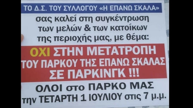 Την Τετάρτη ο Πο.Συ.Λε. παραβρέθηκε στη συνάντηση που διοργάνωσε ο Πολιτιστικός Σύλλογος «Επάνω Σκάλα» όπου πλήθος κόσμου συγκεντρώθηκε, άκουσε τις ομιλίες του προέδρου του συλλόγου κου Μάκη Βενέτα αλλά και της κας Άννας Καραντινού και υπέγραψε το σχετικό ψήφισμα. Έως την άρση της απόφασης του Δημάρχου να γίνει χώρος στάθμευσης αυτοκινήτων το πάρκο ο Σύλλογος "Επάνω Σκάλα" αποφάσισε να τοποθετήσει περιμετρικά του πάρκου μαύρες σημαίες.