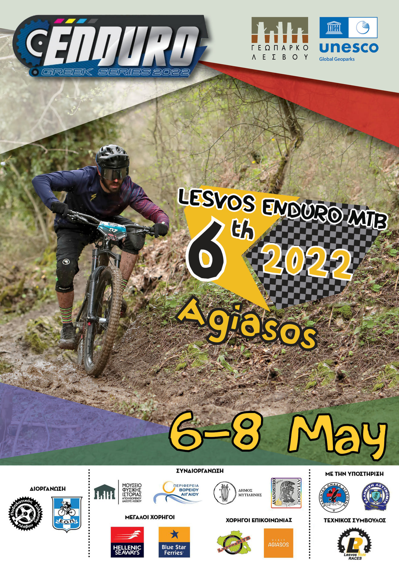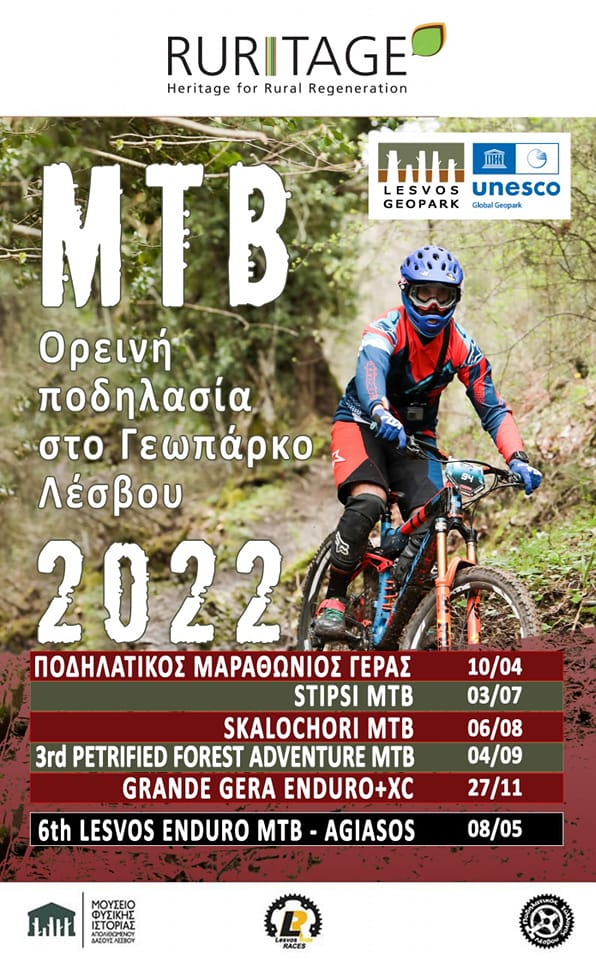 Πρώτος αγώνας για το 2022 είναι ο Ποδηλατικός Μαραθώνιος Γέρας (10/4/2022) όπου το καταπράσινο τοπίο και τα μοναδικά αρώματα των ελαιώνων θα μας χαρίσουν αξέχαστες στιγμές. Στις 7 και 8 Απριλίου την σκυτάλη θα πάρει η Αγιάσος με το 6th Lesvos ENDURO MTB στα μονοπάτια του καστανιώνα κάτω από την επιβλητική βραχώδη κορυφή του Ολύμπου. Ένας αγώνας ενταγμένος στο καλεντάρι της ΕΟΠ και ο πρώτος του πρωταθλήματος Enduro Greek Series 2022. Στις 3 Ιουλίου σειρά έχει η ορεινή Στύψη με τον μοναδικό της αγώνα Urban XC και τις μεγάλες κλίσεις! Στις 6 Αυγούστου θα επισκεφτούμε το δροσερό Σκαλοχώρι με τα υπέροχα καλντερίμια και το πρωτάθλημα XC συνεχίζεται στο μαγευτικό Σίγρι με την ειδικά διαμορφωμένη ποδηλατική διαδρομή εντός του πάρκου Απολιθωμένου Δάσους στις 4 Σεπτεμβρίου. Ο τελικός του τοπικού πρωταθλήματος XC θα πραγματοποιηθεί στις 27 Νοεμβρίου στην Γέρα όπου και θα αναδειχθεί ο πρωταθλητής Λέσβου.