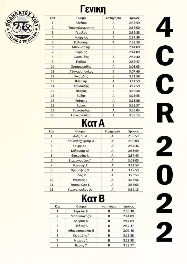 Με το 4CCR 2022 πέφτει η αυλαία των αγωνιστικών δράσεων ποδηλασίας δρόμου στη γειτονική Χίο για το 2022. Το Λεσβιακό ενδιαφέρον επικεντρώνεται στην συμμετοχή των αθλητών του Ποδηλατικού Συλλόγου Λέσβου, Αλεξίου Δημήτρη, Μπουντάκη Χαράλαμπου και Ντάρα Γιώργου.