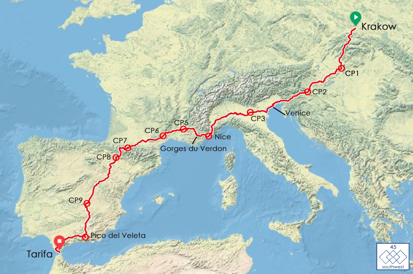 Το 45-SouthWest bikepacking adventure είναι μια συγκεκριμένη διαδρομή 4300km συνολικά με 10 υποχρεωτικά σημεία ελέγχου. Οι αναβάτες μπορούν να επιλέξουν μεταξύ 3 σημείων τερματισμού, Nice, Pico del Veleta και Tarifa.