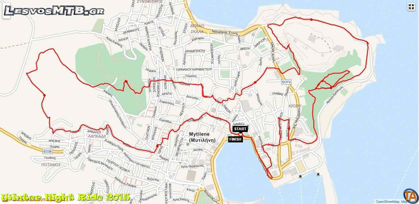 Αν λέγαμε σε κάποιον ότι κάναμε mountain bike μέσα στην πόλη μάλλον θα γελούσε. Κι όμως η διαδρομή περιελάμβανε κάτω από 5% άσφαλτο και έναν συνδυασμό από τα παραδοσιακότερα καλντερίμια της Μυτιλήνης, Σκρά, Τζέημς Αριστάρχου, Περγάμου, Ιγνατίου, Αγ. Αποστόλων, Σατωβριάνδου κ.α, χωματόδρομους και τις πιο απότομες τσιμέντο-ανηφόρες της πόλης.