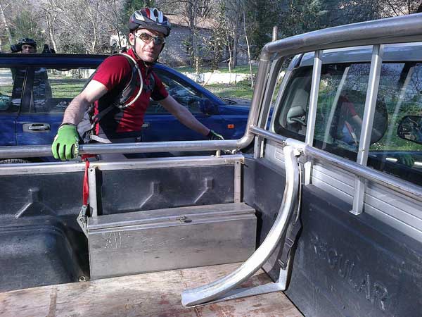 Εμπνευστής και δημιουργός της ποδηλατικής βάσης ο Παναγιώτης Διμπαμπής βρήκε έναν γρήγορο τρόπο μεταφοράς του ποδηλάτου με το αγροτικό. Κουρμπάρησε μια σωλήνα την έκοψε κατά μήκος και την κόλλησε σε μια γωνιασμένη λάμα. Με δυο βίδες προσαρμόζεται στην καρότσα ενώ το ποδήλατο σφηνώνει στην σωλήνα και ασφαλίζει με τον ιμάντα.